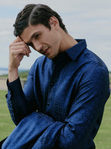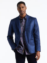 True sophistication requires more than just good taste; it demands the Noble Touch. This commanding navy masterpiece elevates your presence with lustrous silk-blend fabric that captures light like midnight on water, while precisely tailored notch lapels and understated buttons exude refined elegance. The true surprise lies within thanks to an exclusive interior jacquard lining. This limited-edition style transforms every entrance into an arrival worthy of distinction.