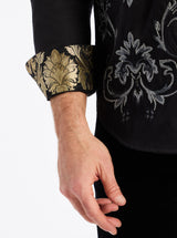 - Silk brocade trim at collar and cuff