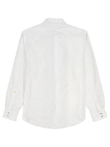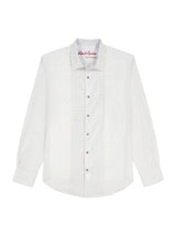 Add a noble touch to your evening attire with our white silk jacquard button down. This meticulously crafted piece features a subtle tonal design inspired by classic Italian tilework. Notice the luxe details that define this exceptional piece, from the shimmering crystal buttons to the matching silk jacquard trims. Engineered for both comfort and distinction, this shirt transforms any formal occasion into an opportunity to showcase your impeccable taste and timeless style.