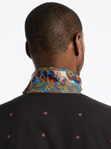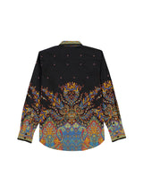 This captivating piece conceals a secret world of wonder inspired by the Taj Mahal's legendary pietra dura art. The design's intricate, colorful patterns emerge from the darkness of the black background, capturing the magical moment of the Taj Mahal, when moonlight kisses the semi-precious stones embedded in the white marble and reveal patterns previously hidden in plain sight. This transformative garment bridges centuries of artistic tradition with contemporary style—a conversation piece that, like its inspiration, reveals its full magnificence under the perfect light.