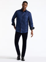 Add a noble touch to your evening attire with our white silk jacquard button down. This meticulously crafted piece features a subtle tonal design inspired by classic Italian tilework. Notice the luxe details that define this exceptional piece, from the shimmering crystal buttons to the matching silk jacquard trims. Engineered for both comfort and distinction, this shirt transforms any formal occasion into an opportunity to showcase your impeccable taste and timeless style.
