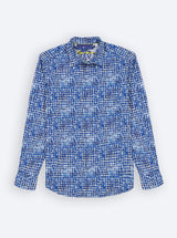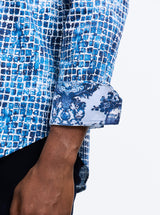 - Contrast print at collar and cuff