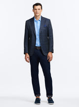Get fancy this season with a subtle jacquard pattern in navy. The jacquard pocket square and contrast interior details give it a signature polish.
