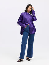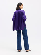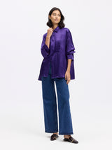 This unexpected take on a classic button-down shirt is sure to turn heads. With a pleated bib front and an oversized fit, this tuxedo-style shirt is instantly event-ready. The silk blend charmeuse fabric feels like a dream and the deep violet shade brings a regal touch.
