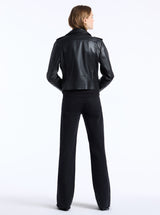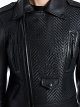 Look effortlessly cool in this asymmetrical leather moto jacket. This style stuns with a herringbone basket weave leather at the front body for a chic contrast to the soft lamb leather sleeves and trim. Zippers at the sleeve cuffs offer a customizable look. Don't miss the interior lining for added warmth and style.