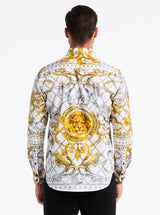 The Dionysian embodies the spirit of the Greek god of wine, with a design that evokes grandeur and decadence. The shirt features a marble statue kicking off the debauchery by pouring red wine into a glass. Set against a luxurious golden scroll pattern, this style boasts silver and golden metallic embroidery that enhances the intricate details. At the back a striking golden lion head commands attention. A bold, sophisticated piece that brings mythological elegance to modern style.