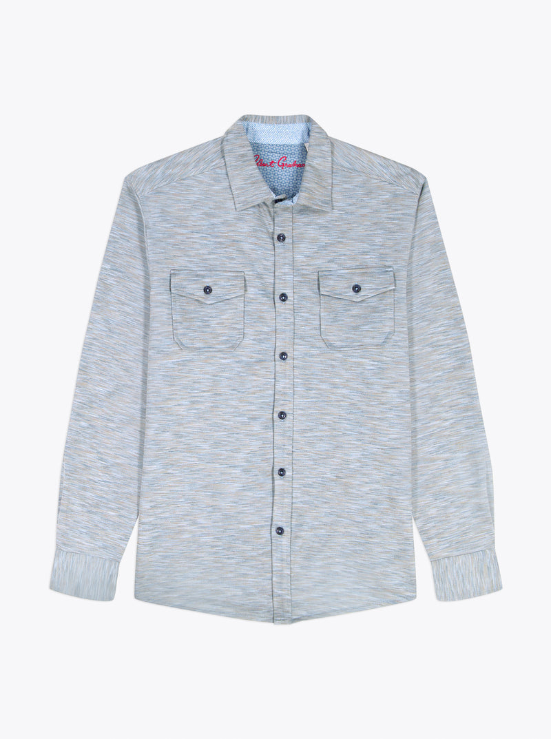 Every wardrobe needs a button down that does it all and the Storrs is just that. Woven with a subtle space dye for visual depth, it stands out on its own or layers effortlessly beneath a blazer. Buttoned chest pockets add utility, while a tonal print at the cuffs offers a hidden hit of personality. Easy, textured, and ready for the season.